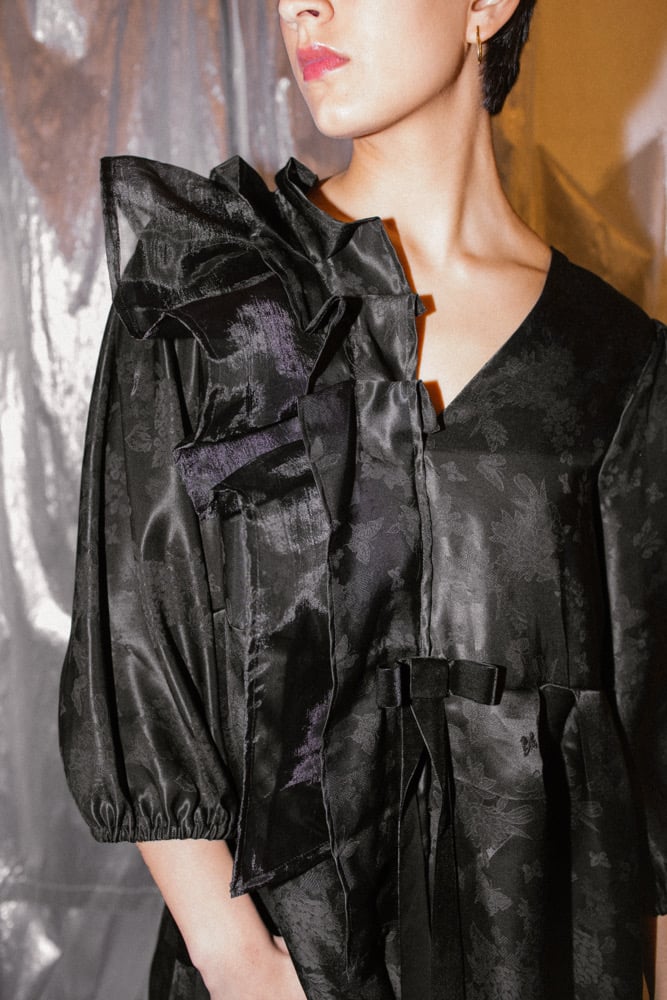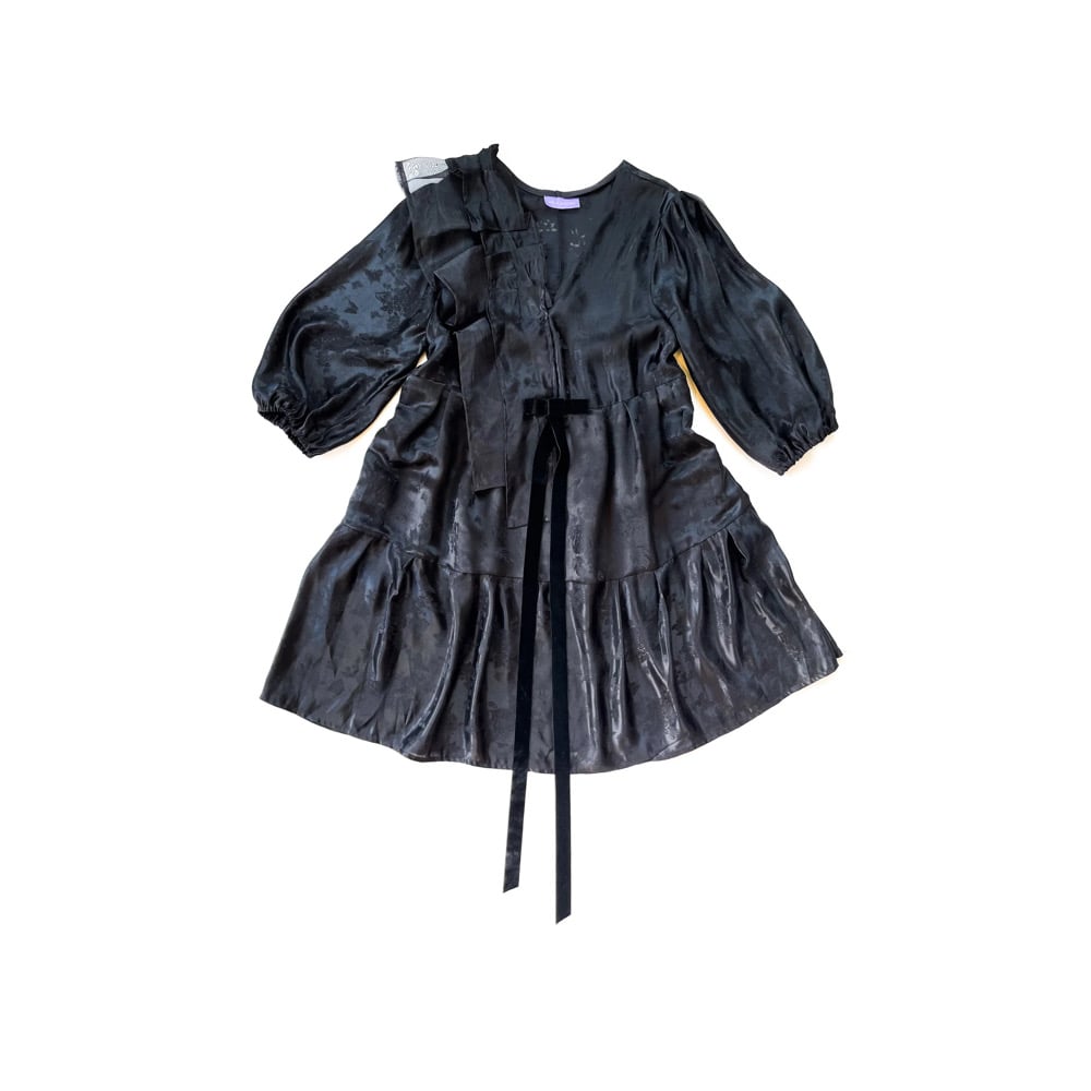 Black butterfly silk jacquard holiday dress with a v-neck. Details include a long velvet ribbon bow and abstract shoulder ruffle that continues down to the waist of the dress. The dress is above the knee with a semi full tiered skirt. Dry Clean Only.